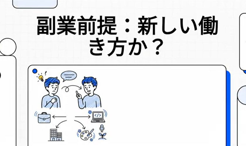 小冊子『未来レポート ~AI時代のビジネスとキャリアを考えるための思考実験ストーリー』の中の「7.副業前提」の解説動画のご紹介です。 解説動画はこちら 「週休4日で副業必須」という、従来の常識を覆す雇用形態を思考実験します。複数の会社で専門性を磨き、人脈を広げる働き方は、大災害や社会変化に強い「個」と「組織」を作ることができるでしょうか。 ※冊子『未来レポート』をご希望される方は「お問い合わせ」よりお申込みください。 お問い合わせ
